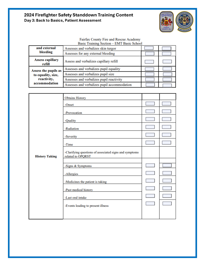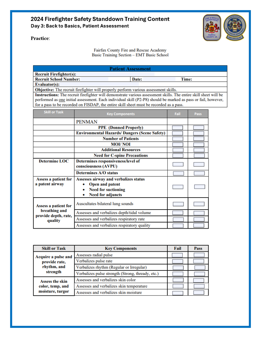 Proficiency in patient assessment is paramount to ensuring high quality patient care. This document outlines essential principles and techniques to ensure FRD personnel can conduct thorough and efficient assessments, optimizing patient care, regardless of one’s EMS certification level. Prioritizing scene safety is foundational, safeguarding both our personnel and patients in hazardous environments. As defined within the 2023 EMS Manual, the initial assessment, employing the ABC approach (Airway, Breathing, Circulation) starts each patient assessment. Rapidly assessing life-threatening conditions then guides immediate interventions and helps to identify Load & Go patients. Next, vital signs provide insights into a patient's physiological status and guide ongoing treatment decisions. Obtaining a comprehensive SAMPLE history (Signs/Symptoms, Allergies, Medications, Past medical history, Last oral intake, Events leading up to the incident) explains pertinent details to inform further care.