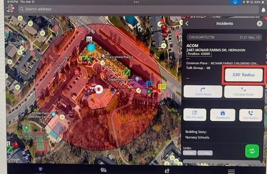 The NOVA Utility Emergencies Manual provides detailed guidance in response to inside and outside gas leaks. To further enhance this response, the FRD has requested First Due Size Up (FDSU) to build a 330-foot radius as a “RECON ZONE” identification tool in the FDSU application. Please note that this photo is a mock-up requested by the FRD for FDSU to develop. This feature will soon allow users to select a button that places a 330-foot radius